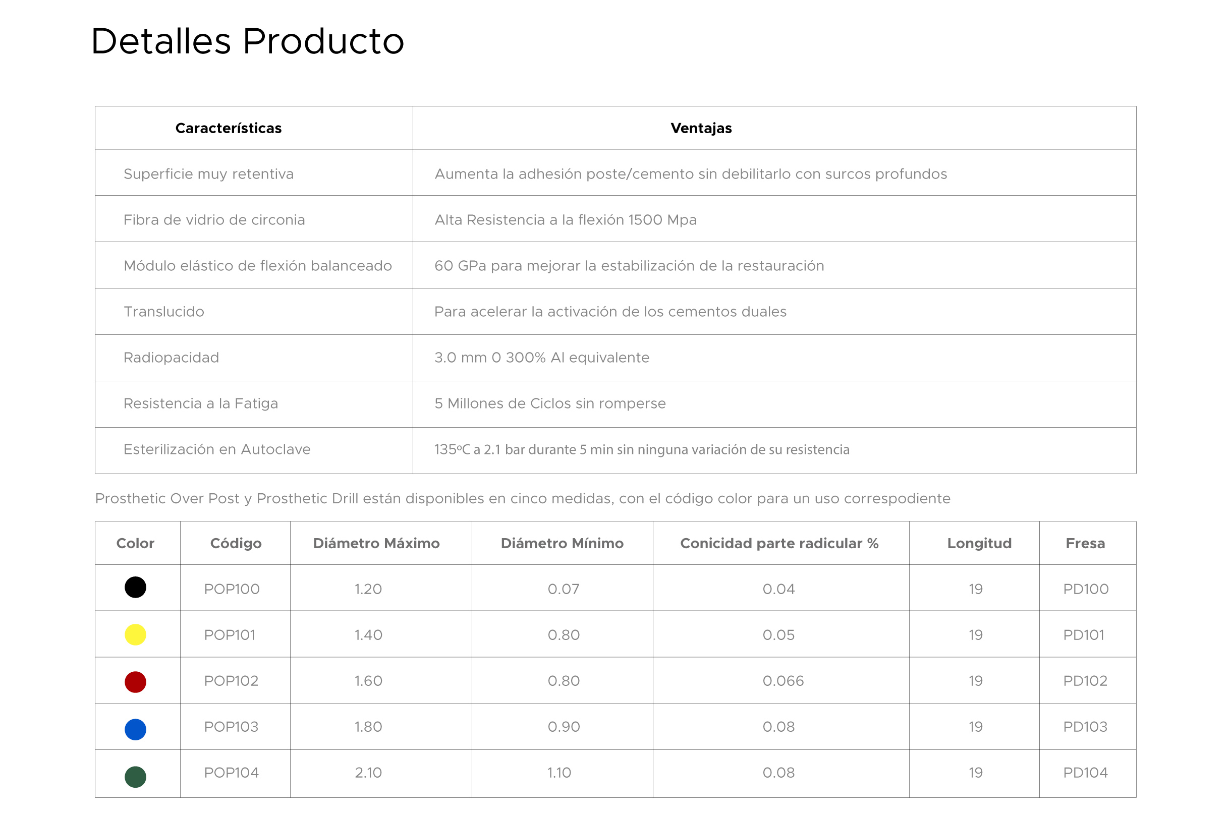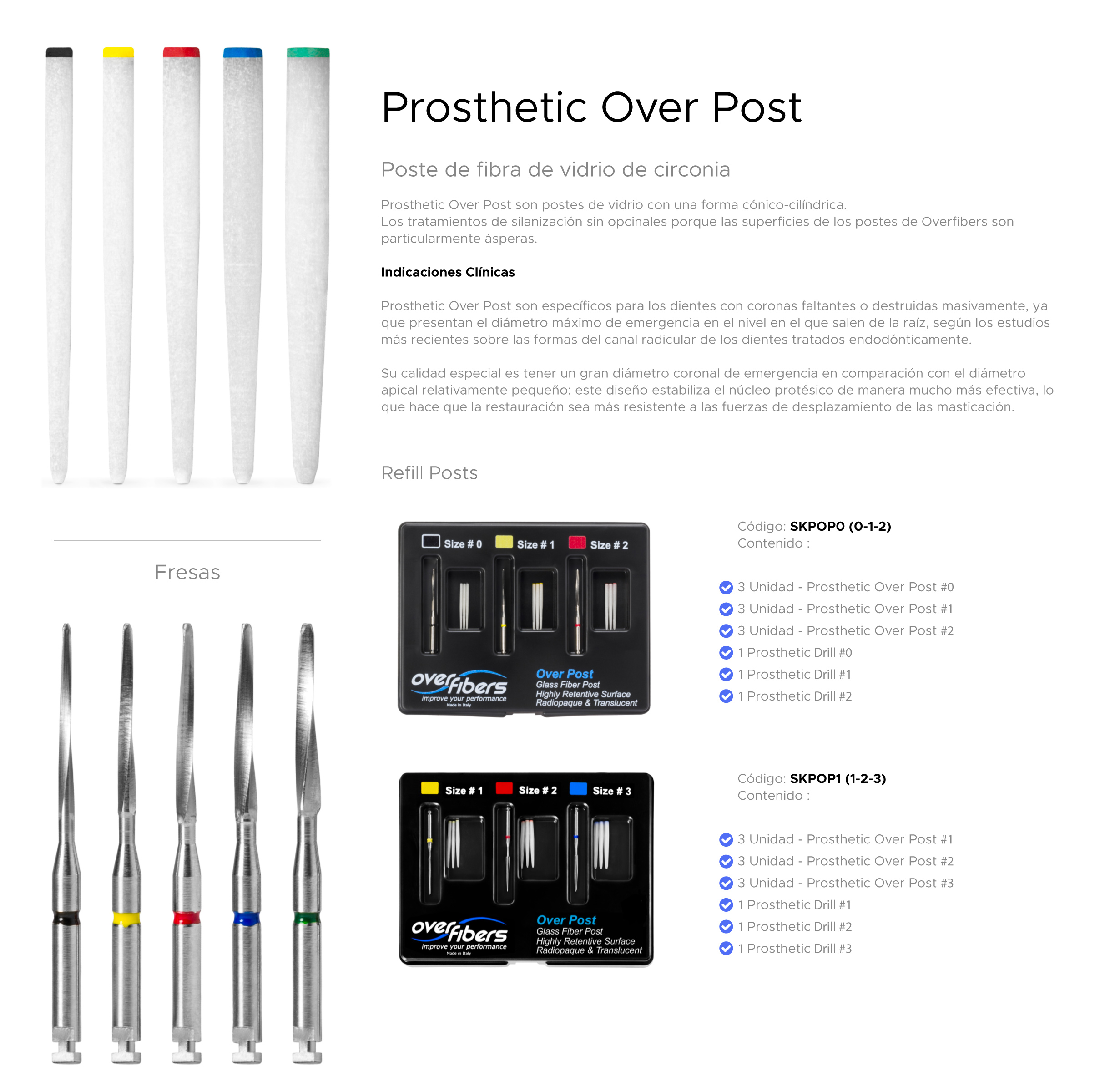 Set de postes Nº1,2,3 o N°0,1,2 con sus respectivas fresas. Formado por 60% fibra de vidrio tipo “s“ y matriz de resina epóxica Para conductos de sección circular Respeta la anatomía del conducto Resistencia a la flexión 1500 Mpa Módulo elástico 60 Gpa Incluye 9 Postes 3 Fresas. Presentación Por kit