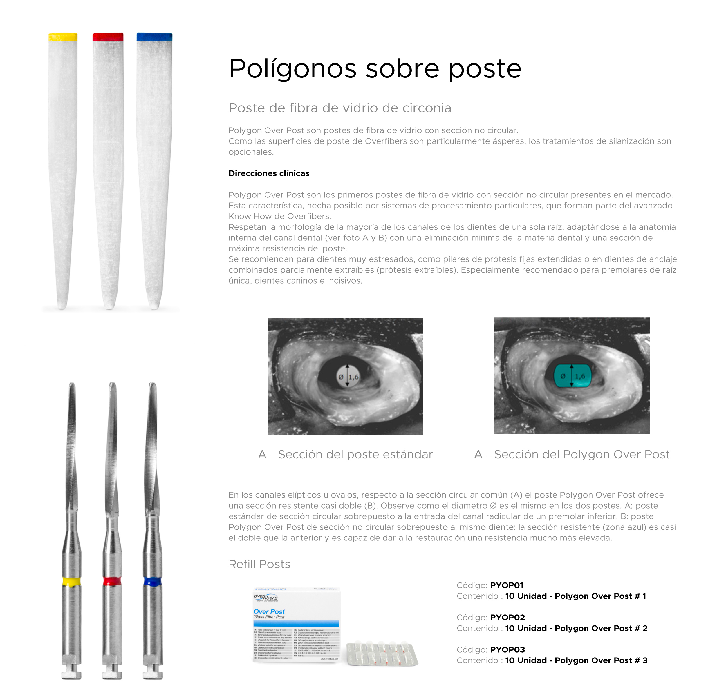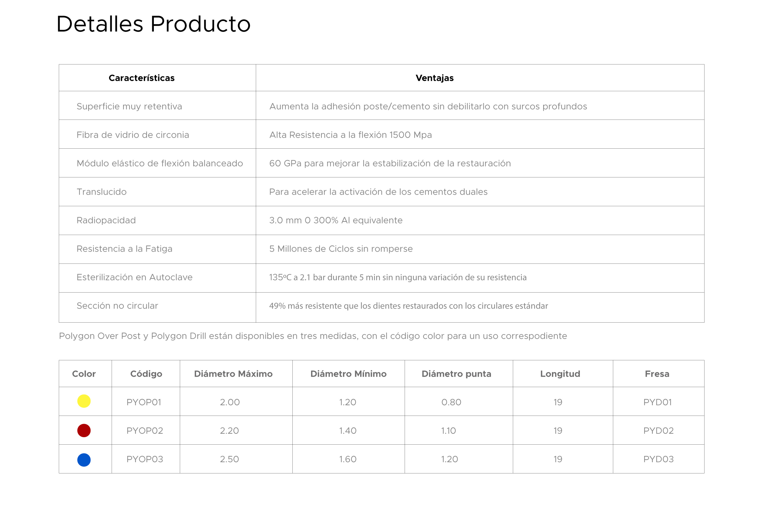 Postes de fibra de vidrio para dientes con poco o ningún tejido coronal residual y sujetos a grandes esfuerzos Sección elíptica Superficie áspera y retentiva Para maximizar la adhesión Translúcido y radiopaco Biocompatible Autoclavable Resiliente Indicados para conductos de ápice cónicos Tamaños No1-->0,8 mm No2-->0,8 mm No3-->0,9 mm Presentación Caja x 10 unidades del mismo número