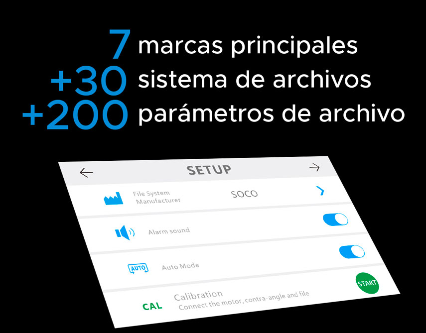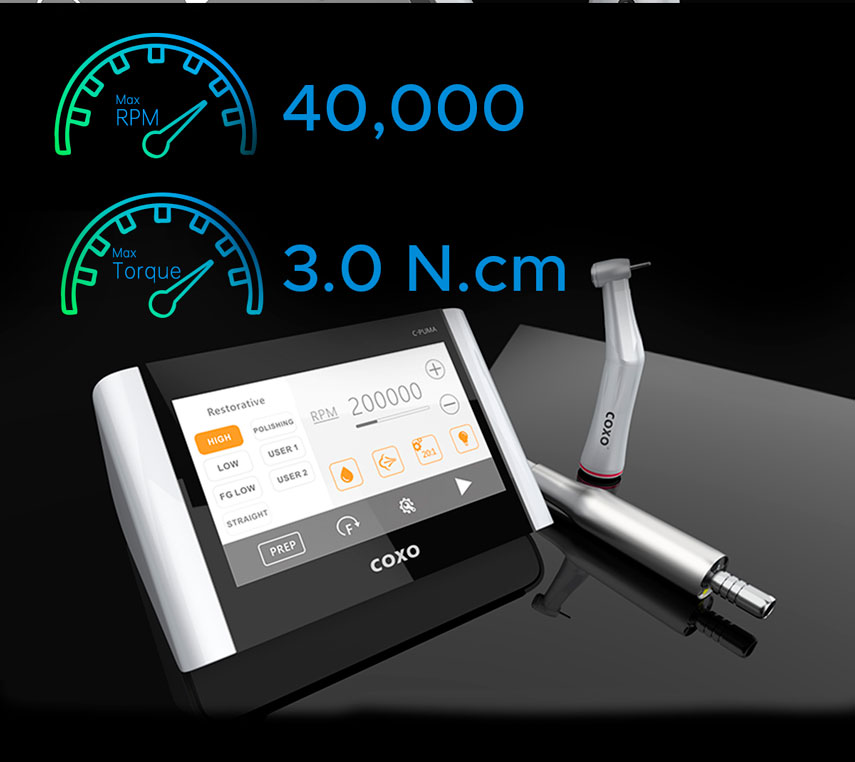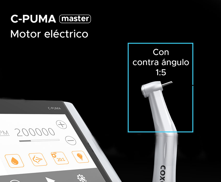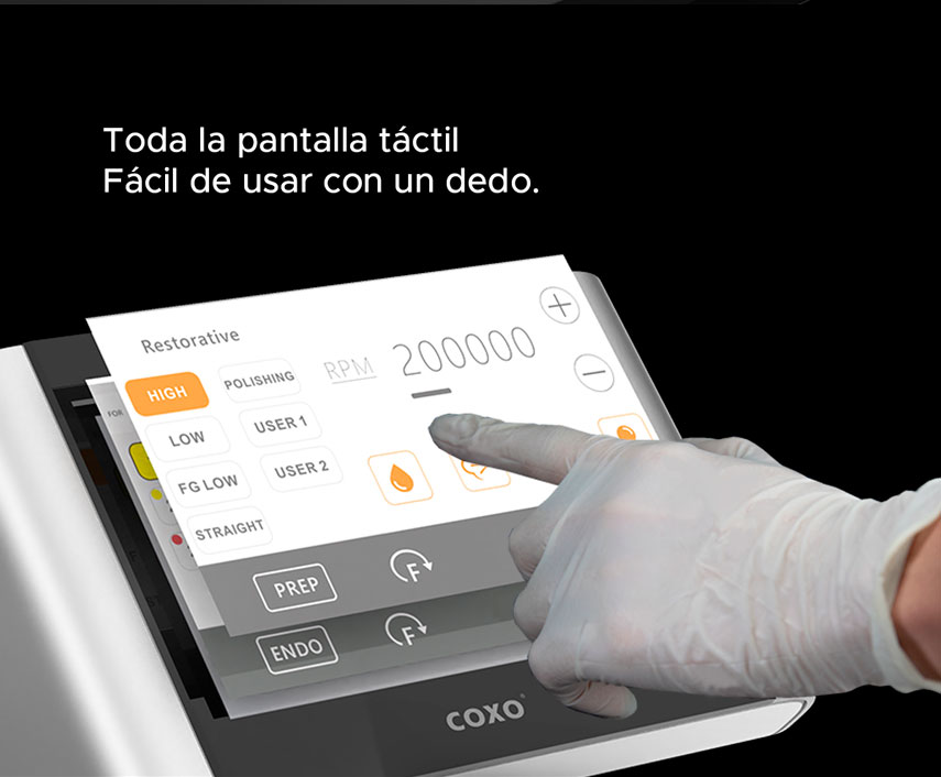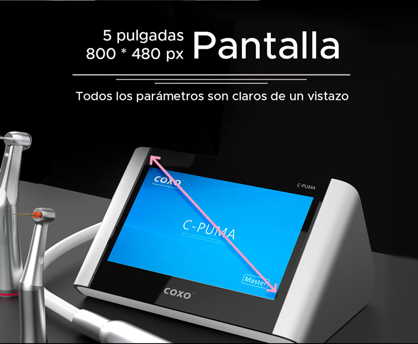 Equipo multiuso eléctrico con un sistema operativo simple, para rehabilitación y endodoncia “2 en 1”. -Ultra confortable para el usuario, permite un control más preciso y estable durante su uso. -Mínima producción de aerosoles y así reducir el riesgo de infecciones y contaminación . -Amplia pantalla touch de 5 pulgadas, fácil de operar y visualización de los parámetros. -Pieza de mano con sistema de enfriamiento por aire, lo que evita el aumento de la temperatura . -Poderosa luz led que permite una excelente visualización del campo oral. -Sistema de irrigación interna más estable. Especificaciones Resolución pantalla: 800 x 480 pixeles. Velocidad: 40.000 rpm. Torque máximo: 3,0 Ncm. Diámetro externo motor: 20,6 mm. Luz LED: > 25.000 lux. -Motor Eléctrico con Contrángulo 1:5 . Velocidad: 10.000~200.000 rpm. Programas: 7 tipos de memorias. -Motor Endodoncia con Contrángulo 6:1. Velocidad: 250~1.200 rpm. Torque: 0.6~5,1 Ncm. Marcas de Limas: 7 tipos. Sistema de limas: más de 30 . Parámetros de limas: más de 200. Incluye 1 Equipo principal 1 Micromotor 2 Contrángulos Accesorios Presentación Por unidad